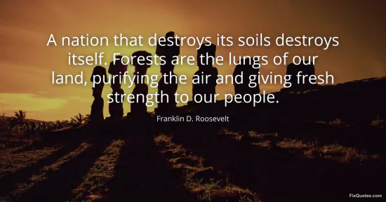 Roosevelt, Franklin D. (2026, January 14). A nation that destroys its soils destroys itself. Forests are the lungs of our land, purifying the air and giving fresh strength to our people. FixQuotes. https://fixquotes.com/quotes/a-nation-that-destroys-its-soils-destroys-itself-25231/