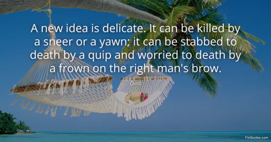 "A new idea is delicate. It can be killed by a sneer or a yawn; it can be stabbed to death by a quip and worried to death by a frown on the right man's brow." FixQuotes, 15 Jan. 2026, https://fixquotes.com/quotes/a-new-idea-is-delicate-it-can-be-killed-by-a-8605/. Accessed 13 Feb. 2026.