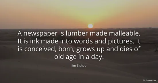 Bishop, Jim. (2026, January 17). A newspaper is lumber made malleable. It is ink made into words and pictures. It is conceived, born, grows up and dies of old age in a day. FixQuotes. https://fixquotes.com/quotes/a-newspaper-is-lumber-made-malleable-it-is-ink-49860/