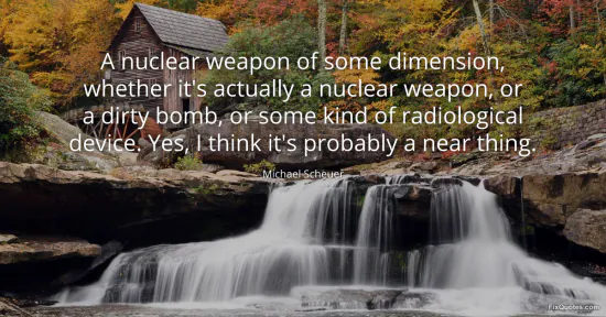 Scheuer, Michael. (2026, January 15). A nuclear weapon of some dimension, whether it's actually a nuclear weapon, or a dirty bomb, or some kind of radiological device. Yes, I think it's probably a near thing. FixQuotes. https://fixquotes.com/quotes/a-nuclear-weapon-of-some-dimension-whether-its-156849/