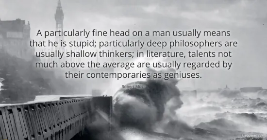 Musil, Robert. "A particularly fine head on a man usually means that he is stupid; particularly deep philosophers are usually shallow thinkers; in literature, talents not much above the average are usually regarded by their contemporaries as geniuses." FixQuotes. January 16, 2026. https://fixquotes.com/quotes/a-particularly-fine-head-on-a-man-usually-means-90220/.