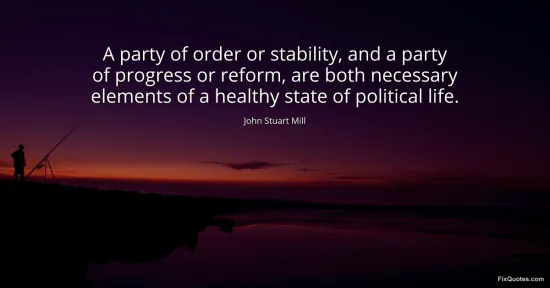 Mill, John Stuart. "A party of order or stability, and a party of progress or reform, are both necessary elements of a healthy state of political life." FixQuotes. January 15, 2026. https://fixquotes.com/quotes/a-party-of-order-or-stability-and-a-party-of-32174/.