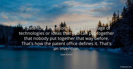 Kamen, Dean. (2026, January 14). A patent, or invention, is any assemblage of technologies or ideas that you can put together that nobody put together that way before. That's how the patent office defines it. That's an invention. FixQuotes. https://fixquotes.com/quotes/a-patent-or-invention-is-any-assemblage-of-3257/