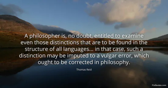 Reid, Thomas. (2026, January 17). A philosopher is, no doubt, entitled to examine even those distinctions that are to be found in the structure of all languages... in that case, such a distinction may be imputed to a vulgar error, which ought to be corrected in philosophy. FixQuotes. https://fixquotes.com/quotes/a-philosopher-is-no-doubt-entitled-to-examine-75952/