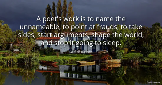 Rushdie, Salman. (2026, January 16). A poet's work is to name the unnameable, to point at frauds, to take sides, start arguments, shape the world, and stop it going to sleep. FixQuotes. https://fixquotes.com/quotes/a-poets-work-is-to-name-the-unnameable-to-point-126164/