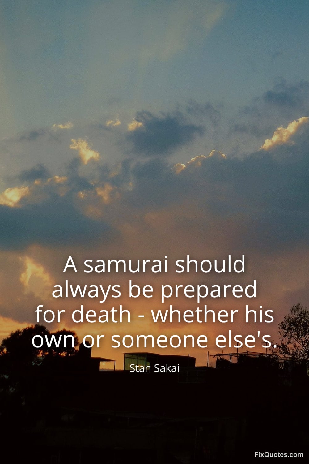 Sakai, Stan. "A samurai should always be prepared for death - whether his own or someone else's." FixQuotes. January 16, 2026. https://fixquotes.com/quotes/a-samurai-should-always-be-prepared-for-death-137048/.