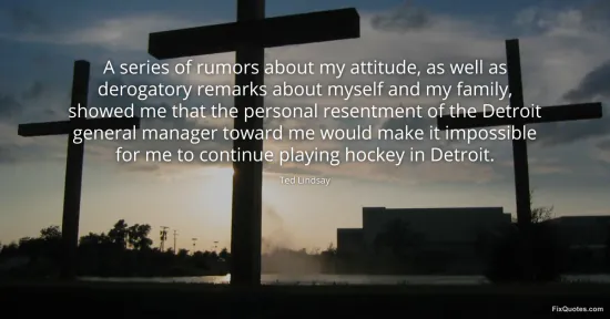 Lindsay, Ted. "A series of rumors about my attitude, as well as derogatory remarks about myself and my family, showed me that the personal resentment of the Detroit general manager toward me would make it impossible for me to continue playing hockey in Detroit." FixQuotes. February 17, 2026. https://fixquotes.com/quotes/a-series-of-rumors-about-my-attitude-as-well-as-107395/.
