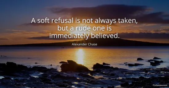 Chase, Alexander. (2026, January 16). A soft refusal is not always taken, but a rude one is immediately believed. FixQuotes. https://fixquotes.com/quotes/a-soft-refusal-is-not-always-taken-but-a-rude-one-97178/