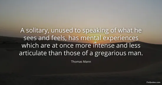 Mann, Thomas. "A solitary, unused to speaking of what he sees and feels, has mental experiences which are at once more intense and less articulate than those of a gregarious man." FixQuotes. January 15, 2026. https://fixquotes.com/quotes/a-solitary-unused-to-speaking-of-what-he-sees-and-3927/.