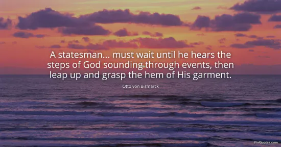 Bismarck, Otto von. (2026, January 16). A statesman... must wait until he hears the steps of God sounding through events, then leap up and grasp the hem of His garment. FixQuotes. https://fixquotes.com/quotes/a-statesman-must-wait-until-he-hears-the-steps-of-116445/