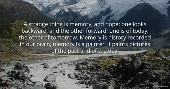Moses, Grandma. (2026, January 16). A strange thing is memory, and hope; one looks backward, and the other forward; one is of today, the other of tomorrow. Memory is history recorded in our brain, memory is a painter, it paints pictures of the past and of the day. FixQuotes. https://fixquotes.com/quotes/a-strange-thing-is-memory-and-hope-one-looks-111938/