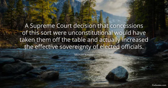 Kinsley, Michael. "A Supreme Court decision that concessions of this sort were unconstitutional would have taken them off the table and actually increased the effective sovereignty of elected officials." FixQuotes. January 15, 2026. https://fixquotes.com/quotes/a-supreme-court-decision-that-concessions-of-this-150988/.