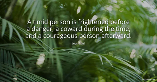 Paul, Jean. "A timid person is frightened before a danger, a coward during the time, and a courageous person afterward." FixQuotes. January 17, 2026. https://fixquotes.com/quotes/a-timid-person-is-frightened-before-a-danger-a-65839/.