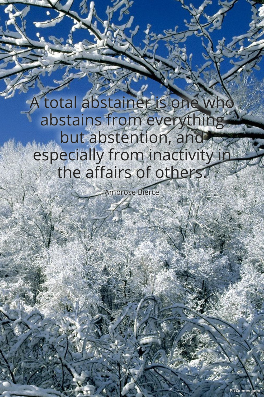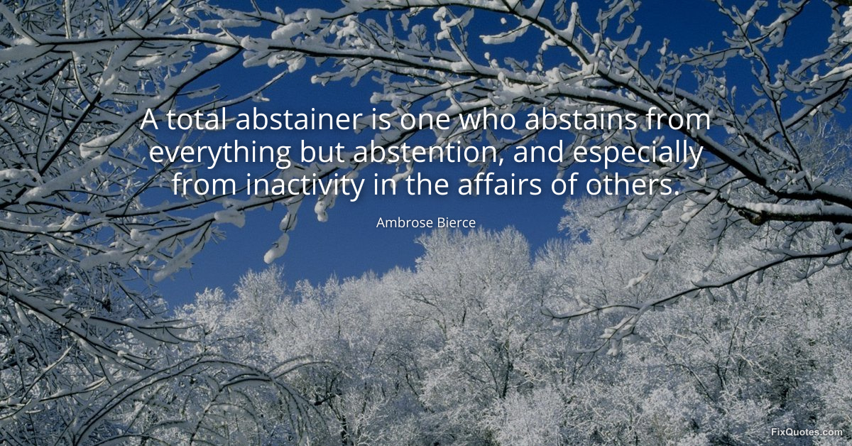 Bierce, Ambrose. (2026, January 17). A total abstainer is one who abstains from everything but abstention, and especially from inactivity in the affairs of others. FixQuotes. https://fixquotes.com/quotes/a-total-abstainer-is-one-who-abstains-from-29750/