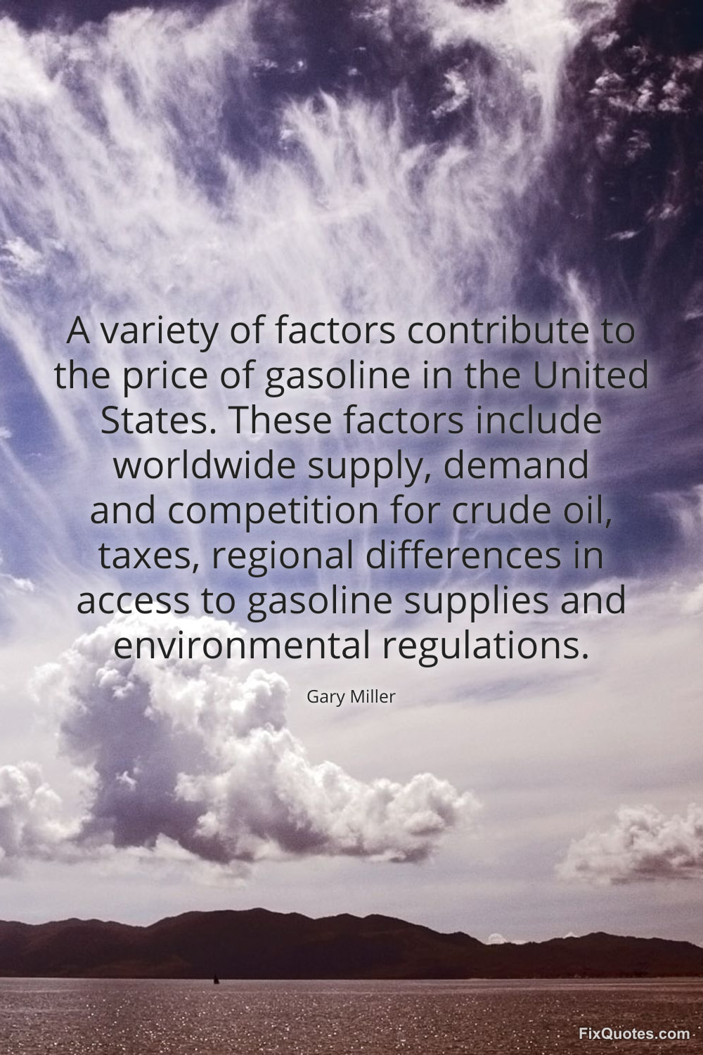 Miller, Gary. "A variety of factors contribute to the price of gasoline in the United States. These factors include worldwide supply, demand and competition for crude oil, taxes, regional differences in access to gasoline supplies and environmental regulations." FixQuotes. January 15, 2026. https://fixquotes.com/quotes/a-variety-of-factors-contribute-to-the-price-of-60350/.