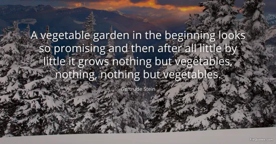 Stein, Gertrude. (2026, January 18). A vegetable garden in the beginning looks so promising and then after all little by little it grows nothing but vegetables, nothing, nothing but vegetables. FixQuotes. https://fixquotes.com/quotes/a-vegetable-garden-in-the-beginning-looks-so-14544/
