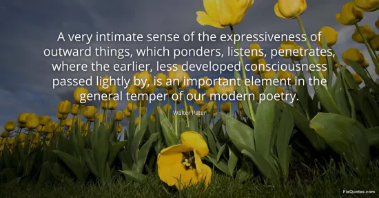 Pater, Walter. (2026, January 15). A very intimate sense of the expressiveness of outward things, which ponders, listens, penetrates, where the earlier, less developed consciousness passed lightly by, is an important element in the general temper of our modern poetry. FixQuotes. https://fixquotes.com/quotes/a-very-intimate-sense-of-the-expressiveness-of-156229/