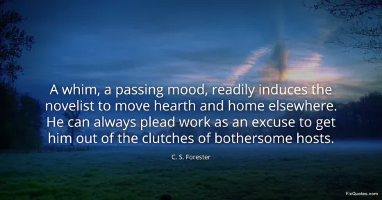Forester, C. S. "A whim, a passing mood, readily induces the novelist to move hearth and home elsewhere. He can always plead work as an excuse to get him out of the clutches of bothersome hosts." FixQuotes. January 17, 2026. https://fixquotes.com/quotes/a-whim-a-passing-mood-readily-induces-the-50402/.