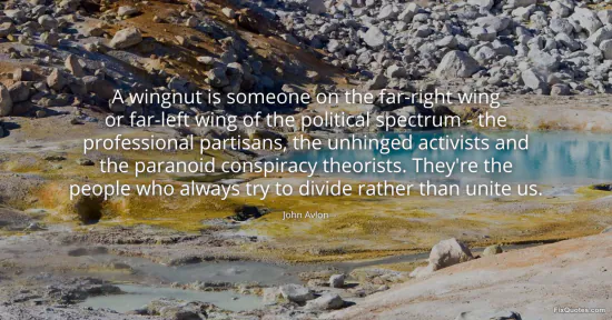 Avlon, John. (2026, January 15). A wingnut is someone on the far-right wing or far-left wing of the political spectrum - the professional partisans, the unhinged activists and the paranoid conspiracy theorists. They're the people who always try to divide rather than unite us. FixQuotes. https://fixquotes.com/quotes/a-wingnut-is-someone-on-the-far-right-wing-or-167786/