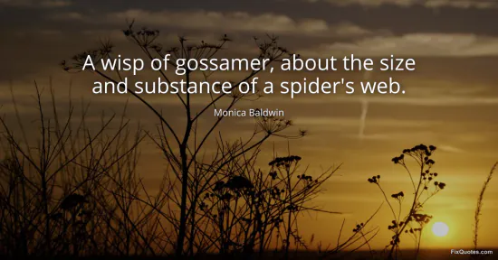 Baldwin, Monica. "A wisp of gossamer, about the size and substance of a spider's web." FixQuotes. January 14, 2026. https://fixquotes.com/quotes/a-wisp-of-gossamer-about-the-size-and-substance-159244/.