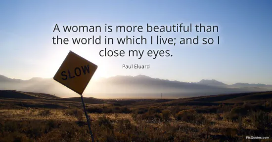 Eluard, Paul. "A woman is more beautiful than the world in which I live; and so I close my eyes." FixQuotes. January 15, 2026. https://fixquotes.com/quotes/a-woman-is-more-beautiful-than-the-world-in-which-127010/.