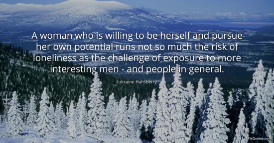 Hansberry, Lorraine. (2026, February 16). A woman who is willing to be herself and pursue her own potential runs not so much the risk of loneliness as the challenge of exposure to more interesting men - and people in general. FixQuotes. https://fixquotes.com/quotes/a-woman-who-is-willing-to-be-herself-and-pursue-158995/