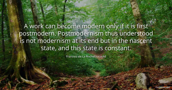 Rochefoucauld, Francois de La. (2026, January 18). A work can become modern only if it is first postmodern. Postmodernism thus understood is not modernism at its end but in the nascent state, and this state is constant. FixQuotes. https://fixquotes.com/quotes/a-work-can-become-modern-only-if-it-is-first-21242/
