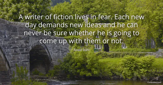 Dahl, Roald. (2026, January 17). A writer of fiction lives in fear. Each new day demands new ideas and he can never be sure whether he is going to come up with them or not. FixQuotes. https://fixquotes.com/quotes/a-writer-of-fiction-lives-in-fear-each-new-day-71134/