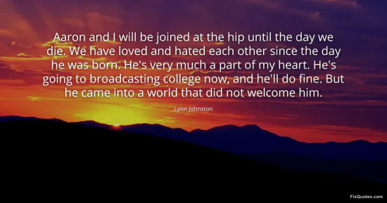 Johnston, Lynn. (2026, January 17). Aaron and I will be joined at the hip until the day we die. We have loved and hated each other since the day he was born. He's very much a part of my heart. He's going to broadcasting college now, and he'll do fine. But he came into a world that did not welcome him. FixQuotes. https://fixquotes.com/quotes/aaron-and-i-will-be-joined-at-the-hip-until-the-64930/