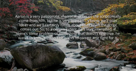 Whitford, Bradley. (2026, January 15). Aaron is a very passionate, maniacal writer so the scripts really come from him, but he is very open to... y'know, we'll plan ideas and we'll certainly tussle about stuff when the script comes out. So, to a certain extent, he's very interested. If there's some problem or something that doesn't ring true, he wants to know why and he wants to correct it or fight for it. FixQuotes. https://fixquotes.com/quotes/aaron-is-a-very-passionate-maniacal-writer-so-the-141800/