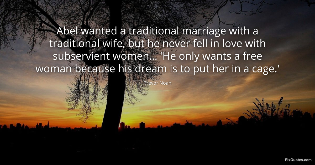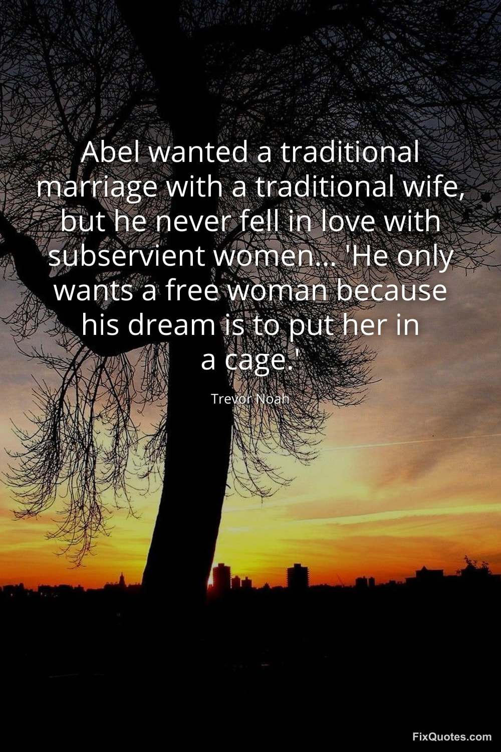 Noah, Trevor. "Abel wanted a traditional marriage with a traditional wife, but he never fell in love with subservient women… 'He only wants a free woman because his dream is to put her in a cage.'." FixQuotes. February 3, 2026. https://fixquotes.com/quotes/abel-wanted-a-traditional-marriage-with-a-184872/.