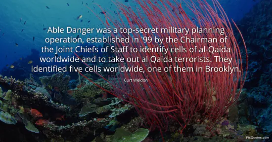 Weldon, Curt. (2026, January 17). Able Danger was a top-secret military planning operation, established in '99 by the Chairman of the Joint Chiefs of Staff to identify cells of al-Qaida worldwide and to take out al Qaida terrorists. They identified five cells worldwide, one of them in Brooklyn. FixQuotes. https://fixquotes.com/quotes/able-danger-was-a-top-secret-military-planning-77744/