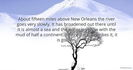Yerby, Frank. "About fifteen miles above New Orleans the river goes very slowly. It has broadened out there until it is almost a sea and the water is yellow with the mud of half a continent. Where the sun strikes it, it is golden." FixQuotes. January 16, 2026. https://fixquotes.com/quotes/about-fifteen-miles-above-new-orleans-the-river-111227/.