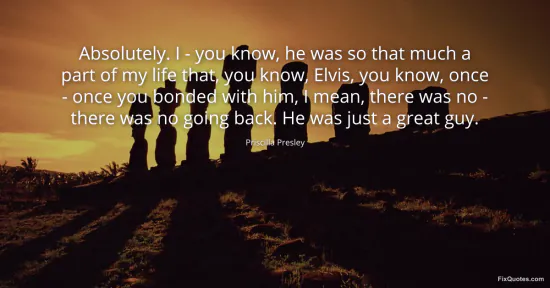 Presley, Priscilla. "Absolutely. I - you know, he was so that much a part of my life that, you know, Elvis, you know, once - once you bonded with him, I mean, there was no - there was no going back. He was just a great guy." FixQuotes. January 15, 2026. https://fixquotes.com/quotes/absolutely-i-you-know-he-was-so-that-much-a-165666/.