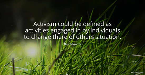 Edwards, Ben. "Activism could be defined as activities engaged in by individuals to change there of others situation." FixQuotes. January 17, 2026. https://fixquotes.com/quotes/activism-could-be-defined-as-activities-engaged-64076/.