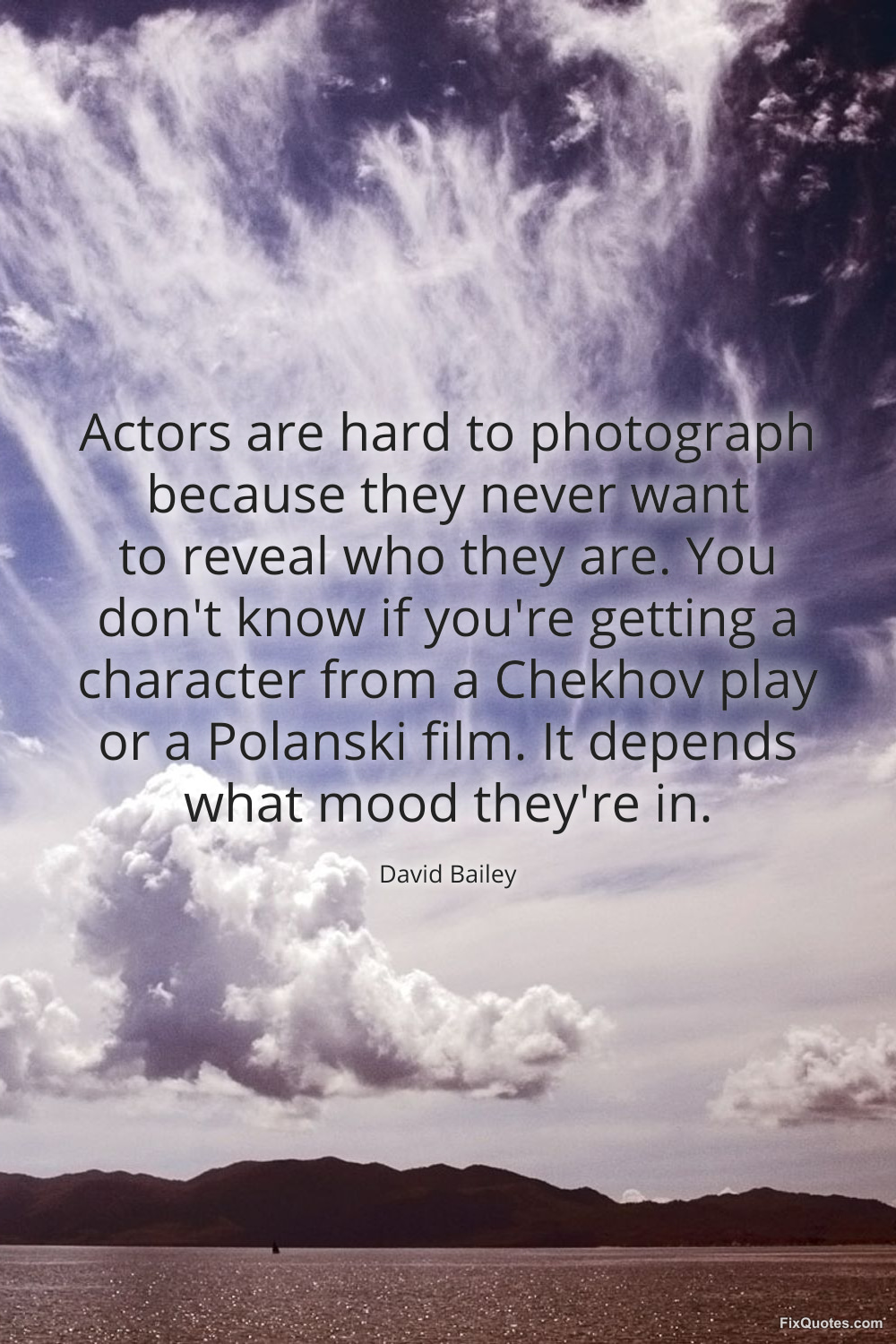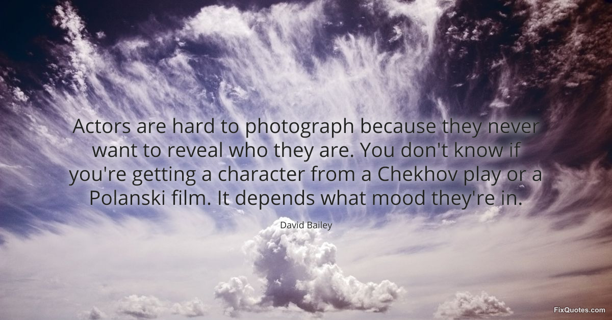 Bailey, David. "Actors are hard to photograph because they never want to reveal who they are. You don't know if you're getting a character from a Chekhov play or a Polanski film. It depends what mood they're in." FixQuotes. March 23, 2026. https://fixquotes.com/quotes/actors-are-hard-to-photograph-because-they-never-186255/.