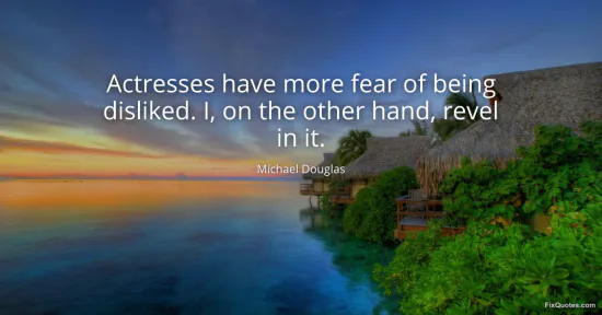 Douglas, Michael. "Actresses have more fear of being disliked. I, on the other hand, revel in it." FixQuotes. January 16, 2026. https://fixquotes.com/quotes/actresses-have-more-fear-of-being-disliked-i-on-97155/.