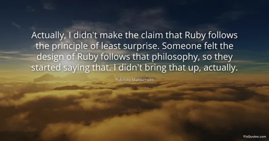 "Actually, I didn't make the claim that Ruby follows the principle of least surprise. Someone felt the design of Ruby follows that philosophy, so they started saying that. I didn't bring that up, actually." FixQuotes, 16 Jan. 2026, https://fixquotes.com/quotes/actually-i-didnt-make-the-claim-that-ruby-follows-134939/. Accessed 12 Feb. 2026.
