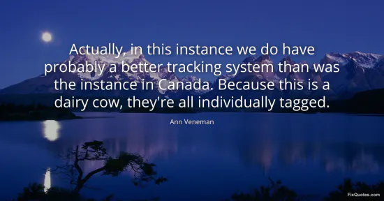 Veneman, Ann. "Actually, in this instance we do have probably a better tracking system than was the instance in Canada. Because this is a dairy cow, they're all individually tagged." FixQuotes. January 16, 2026. https://fixquotes.com/quotes/actually-in-this-instance-we-do-have-probably-a-109047/.