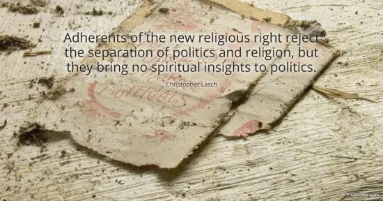 Lasch, Christopher. (2026, January 17). Adherents of the new religious right reject the separation of politics and religion, but they bring no spiritual insights to politics. FixQuotes. https://fixquotes.com/quotes/adherents-of-the-new-religious-right-reject-the-48826/