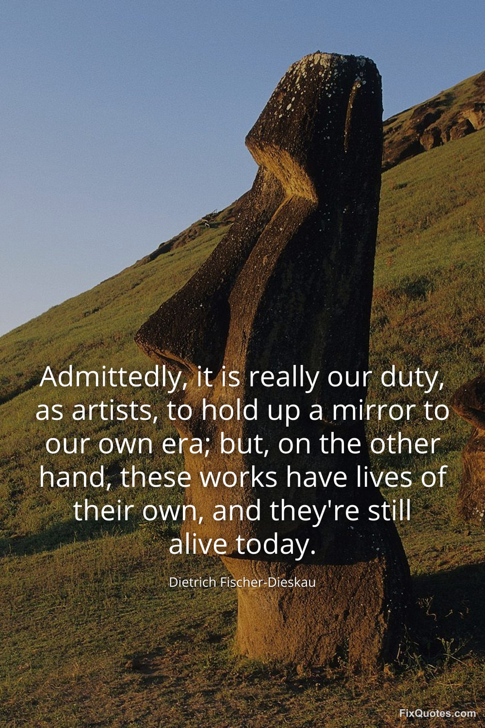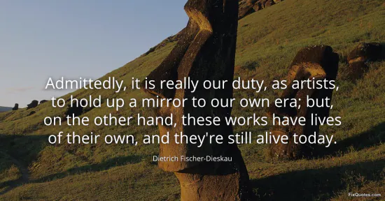 Fischer-Dieskau, Dietrich. "Admittedly, it is really our duty, as artists, to hold up a mirror to our own era; but, on the other hand, these works have lives of their own, and they're still alive today." FixQuotes. January 15, 2026. https://fixquotes.com/quotes/admittedly-it-is-really-our-duty-as-artists-to-148849/.