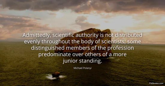 Polanyi, Michael. "Admittedly, scientific authority is not distributed evenly throughout the body of scientists; some distinguished members of the profession predominate over others of a more junior standing." FixQuotes. January 17, 2026. https://fixquotes.com/quotes/admittedly-scientific-authority-is-not-57423/.