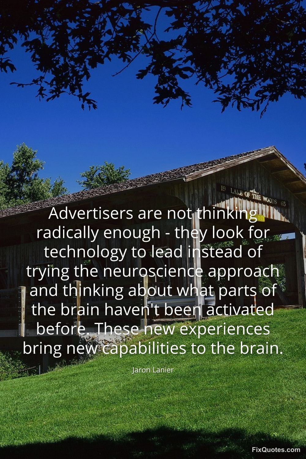 Lanier, Jaron. (2026, January 15). Advertisers are not thinking radically enough - they look for technology to lead instead of trying the neuroscience approach and thinking about what parts of the brain haven't been activated before. These new experiences bring new capabilities to the brain. FixQuotes. https://fixquotes.com/quotes/advertisers-are-not-thinking-radically-enough-56455/