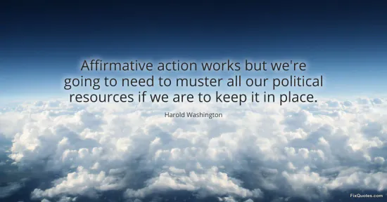 Washington, Harold. "Affirmative action works but we're going to need to muster all our political resources if we are to keep it in place." FixQuotes. January 15, 2026. https://fixquotes.com/quotes/affirmative-action-works-but-were-going-to-need-53924/.