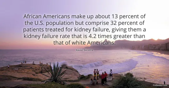 Becerra, Xavier. "African Americans make up about 13 percent of the U.S. population but comprise 32 percent of patients treated for kidney failure, giving them a kidney failure rate that is 4.2 times greater than that of white Americans." FixQuotes. January 16, 2026. https://fixquotes.com/quotes/african-americans-make-up-about-13-percent-of-the-92600/.