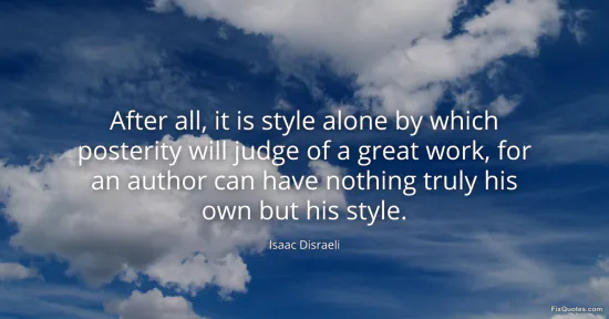 Disraeli, Isaac. (2026, January 16). After all, it is style alone by which posterity will judge of a great work, for an author can have nothing truly his own but his style. FixQuotes. https://fixquotes.com/quotes/after-all-it-is-style-alone-by-which-posterity-89300/