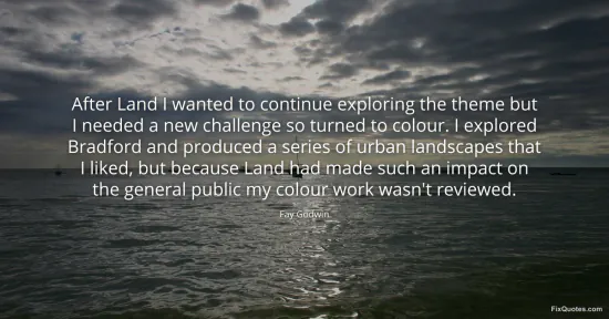 Godwin is describing a familiar trap: the public doesn’t just discover an artist’s work, it brands it. Land wasn’t merely a project; it became a reception event, a defining lens through which audiences and editors decided what kind of photographer she was allowed to be. The blunt sting is in the last clause - “my colour work wasn’t reviewed” - a passive construction that quietly indicts gatekeepers while keeping her own tone controlled, almost English in its restraint. She doesn’t claim the work failed. She says it was unseen.
