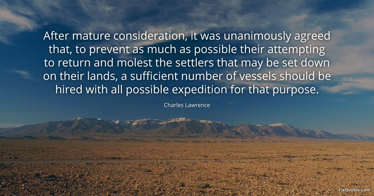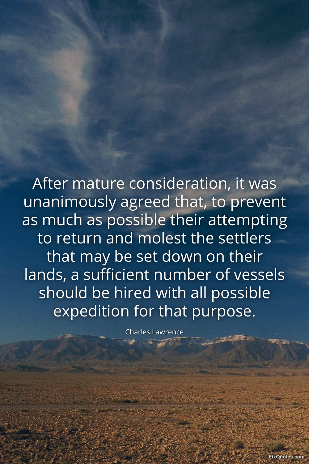 Lawrence, Charles. "After mature consideration, it was unanimously agreed that, to prevent as much as possible their attempting to return and molest the settlers that may be set down on their lands, a sufficient number of vessels should be hired with all possible expedition for that purpose." FixQuotes. February 16, 2026. https://fixquotes.com/quotes/after-mature-consideration-it-was-unanimously-135959/.