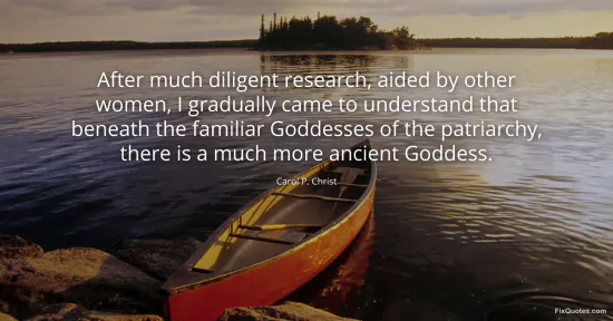 Christ, Carol P. "After much diligent research, aided by other women, I gradually came to understand that beneath the familiar Goddesses of the patriarchy, there is a much more ancient Goddess." FixQuotes. January 15, 2026. https://fixquotes.com/quotes/after-much-diligent-research-aided-by-other-women-51776/.