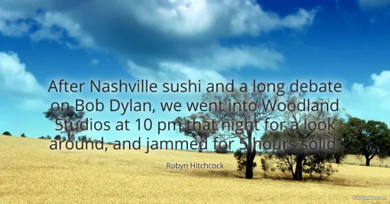 Hitchcock, Robyn. "After Nashville sushi and a long debate on Bob Dylan, we went into Woodland Studios at 10 pm that night for a look around, and jammed for 5 hours solid." FixQuotes. January 17, 2026. https://fixquotes.com/quotes/after-nashville-sushi-and-a-long-debate-on-bob-77150/.